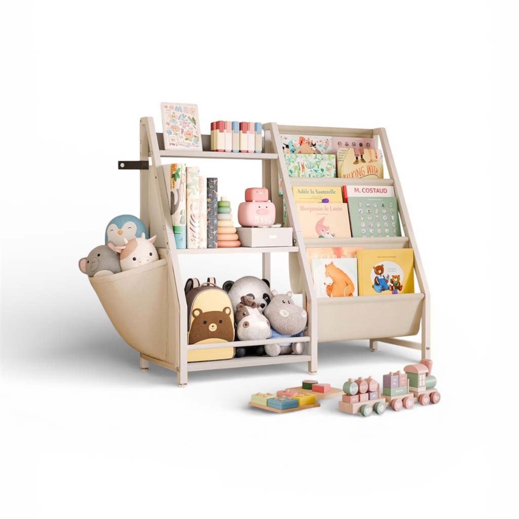 En el lado izquierdo, puedes almacenar bloques de construcción, bolas, camiones pequeños, juguetes de peluche, autos modelo, recuerdos, obras de arte y mucho más. En el lado derecho, puede almacenar libros de lectura, libros para colorear, cómics, libros ilustrados u otros libros